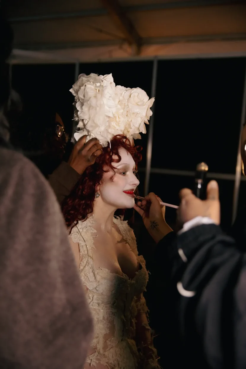 Chappell Roan também revelou que estava nervosa para desfilar aquele véu no palco: em suas próprias palavras, enquanto descia as escadas para entrar no palco, pensava: “Deus, por favor, não deixe eu cair.” E não foi apenas ela — Webb compartilha que teve um momento de pânico antes do show, quando manchou o figurino com café durante os preparativos, algo que, para ela, “McQueen provavelmente teria achado emocionante.”