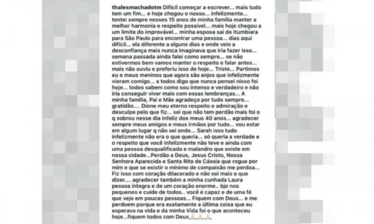 Horas antes da tragédia, Thales publicou nas redes sociais uma mensagem direcionada os filhos: “Que Deus abençoe sempre meus filhos. Papai ama muito”. Ele também teria deixado uma carta de despedida direcionada aos familiares, na qual mencionava dificuldades no casamento e relatava a descoberta de uma suposta traição. Confira a carta: